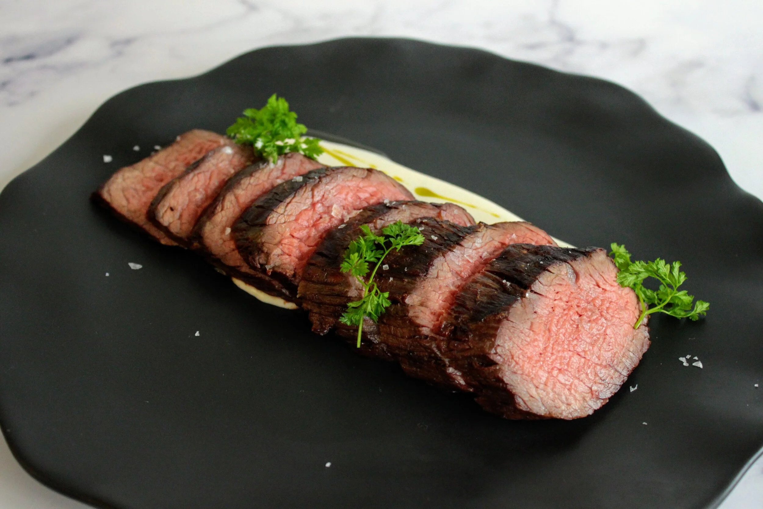 After resting for a few minutes, thinly slice the Teres Major into medallions. Plate the beef fat soubise and EVOO drizzle and add together the the beef medallions on top. For extra garnish and color, add parsley to taste. Serve and bask!